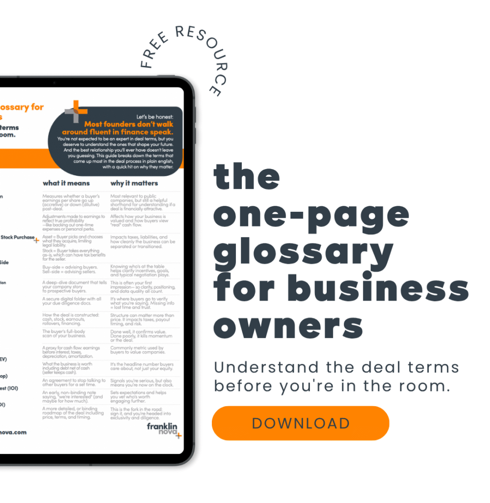 A plain-English guide to the deal terms every business owner should know. Whether you’re thinking about selling, raising capital, or just planning ahead, this glossary helps you ask better questions and make confident decisions.